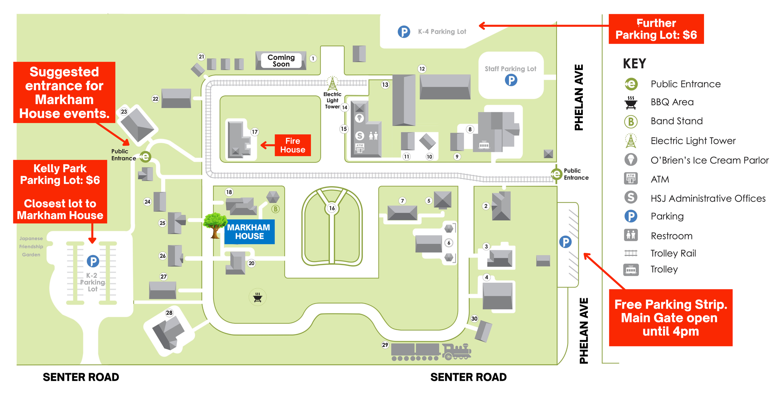 Location: Once you walk into the park from Phelan Avenue, go straight until the road veers left with the firehouse on the right, then follow the left turn. Markham House is then the second house on your left. There should be an OPEN flag out on the porch.