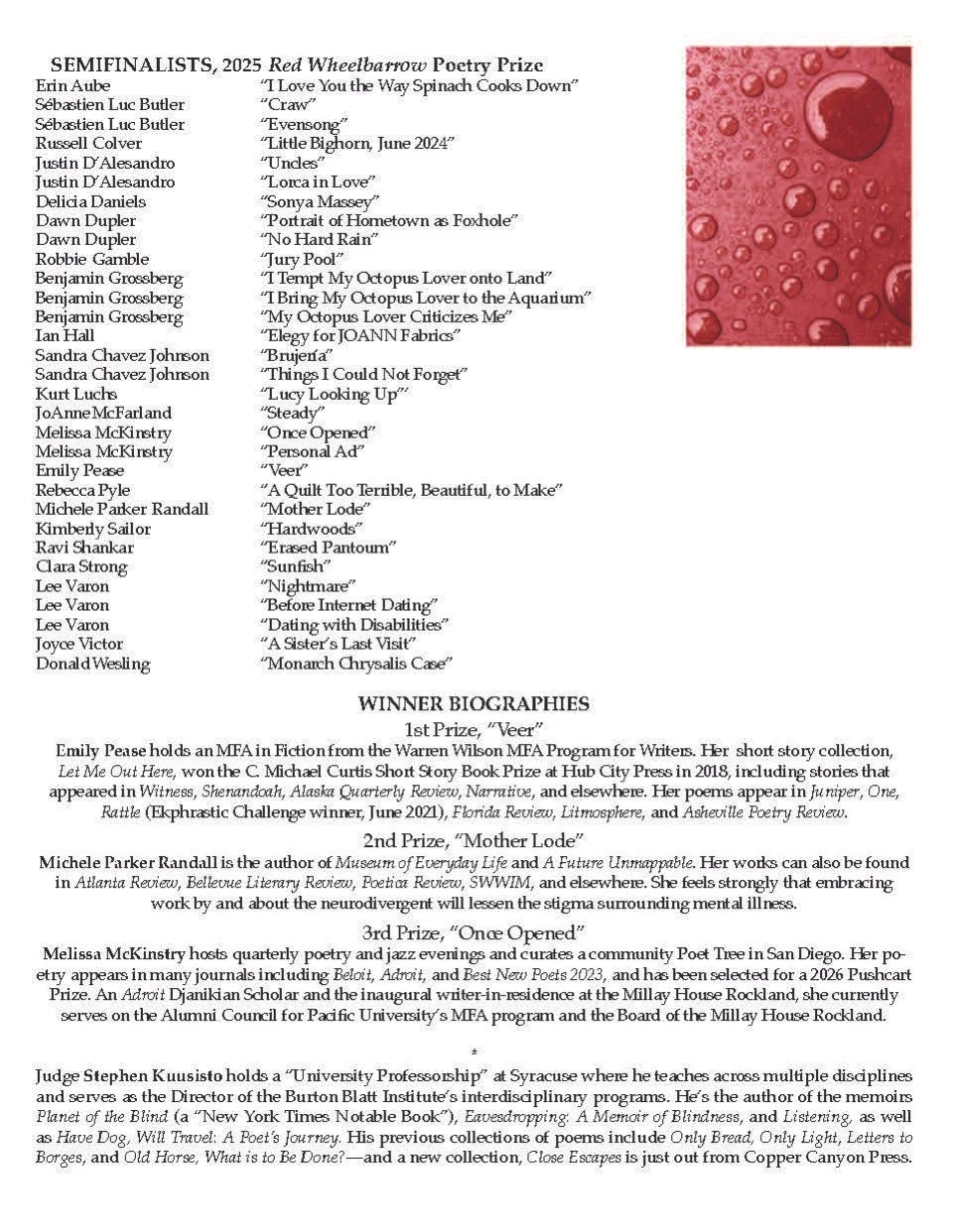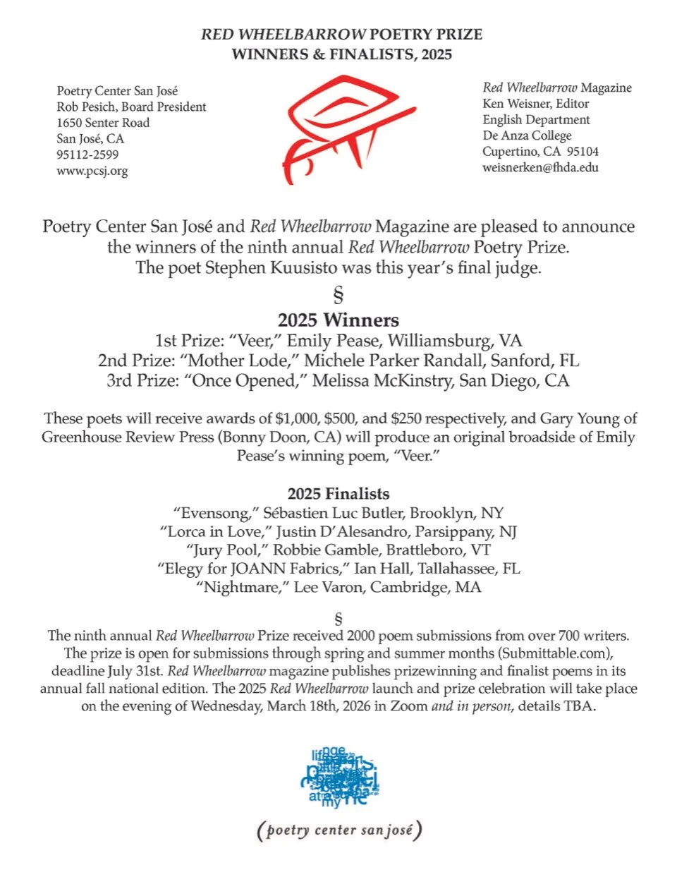 Poetry Center San José and Red Wheelbarrow Magazine announce the 2025 Red Wheelbarrow Poetry Prize winners, judged by poet Stephen Kuusisto: